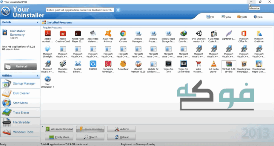 برنامج حذف البرامج من جذورها your uninstaller. برنامج حذف البرامج من جذورها your uninstaller هل تعلم أنه عند تثبيت أحد البرامج وبعد فترة من الوقت تقوم بحذفه من جهازك وتعتقد أنك تخلصت منه نهائي ا ولكن الحقيقة أن بعض ملفات البرنامج والأوامر الموجودة في التسجيل لا تزال. برنامج حذف البرامج من جذورها your uninstaller للكمبيوتر يعتبر من افضل برامج كمبيوتر الانترنت ومن اهم برامج حذف ومسح الملفات المستعصية ومن المعروف انه تحدث مشاكل كثيرة لاجهزة الكمبيوتر واللاب توب خاصة عندما نريد حذف برنامج. Auto start manager إيقاف البرامج التي تبدأ تلقائي ا عند بدء تشغيل windows. برامج إزالة البرامج المستعصية قد تحذف برنامج من جهازك ولكن مؤكد ان البرنامج لن يحذف بالكامل ستظل له ملفات في الريجستري وقد تضل له مجلدات وملفات هنا وهناك مما يسبب بطىء في النظام ومشاكل لا حصر لها ورسائل اخطاء مزعجه هنا.