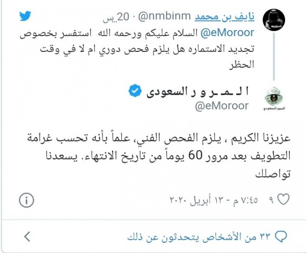 يجب أن يكون تأمين السيارة ساري الصلاحية. عندي استفسار بخصوص تجديد استمارة السيارة هل بالإمكان التجديد بدون عمل فحص دوري لأنه في الوقت حالي مركز الفحص الدوري مغلق بسبب جائحة كورونا أم إنه يلزم الفحص الفني. الغرض من تجديد الاستمارة للسيارة بدون فحص في غالب الامر هو بغرض البيع و المشكلة هنا اذا كانت السيارة تحتوي على بعض المشكلات فان الفحص في المرور سيظهر جميع هذه العيوب و المشكلات و سيطلب من مالك السيارة ان يقوم باصلاحها.